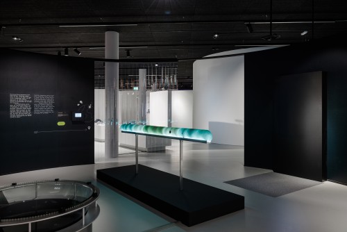 The sculpture consists of a glacial core placed horizontally on a metal frame and illuminated by a strip of LEDs. The core is made of different shades of recycled glass, and within its layers, cables of varying thicknesses and colors are integrated. Inspired by research conducted on the Alpine subsurface, these cables narrate the history of technological transitions in mountain telecommunication cables. While water is a vital resource for human survival, infrastructure (networks) have become indispensable for communication.