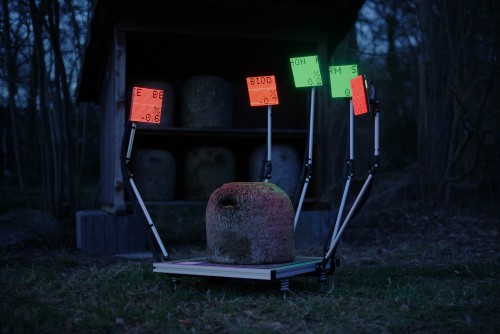 Fragmentin and Apian have designed a sculptural and performative device that highlights the brutality and absurdity of using these technologies in our current capitalist system. The sculpture, reminiscent of a mechanical hand, seems to close in on the hive positioned at its center. Certain details of the device refer to capturing elements such as a scale - one of the most used sensors in digital beekeeping - or even a measuring grid. At the top of each phalanx is an LED screen, reminiscent of stock market screens. The selection of materials contrasts with the natural context in which the performances were filmed, highlighting the absurdity of the current context while proposing a new hybrid aesthetic between nature and technology, suggesting another possible use for these technologies.