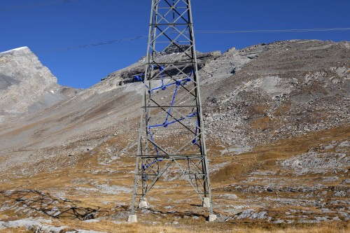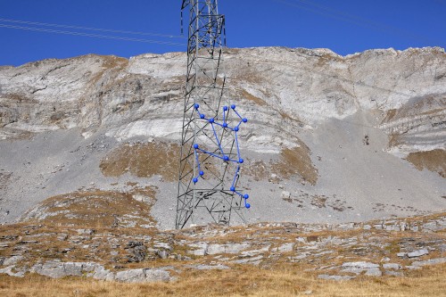 MARKERS is a monumental 17-meter-high sculpture installed on a high-voltage power line pylon — a first in Switzerland. Drawing on the aesthetics of the digital world and the algorithmic vision of machines, the work functions as an assisted ready-made, composed of recycled aerial marker balls. It draws attention to two crucial issues: energy supply and the impact of infrastructure on the natural landscape.
